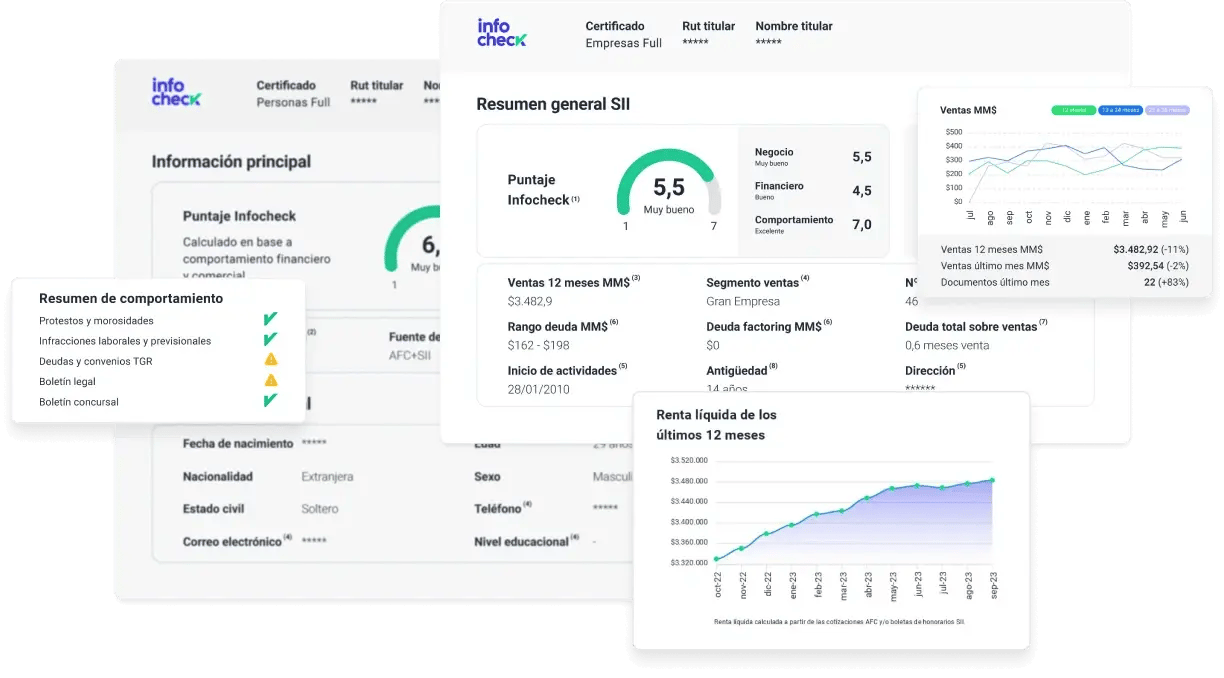 Con Infocheck accedes a una radiografía detallada y confiable de tu perfil financiero. Obtén en línea un completo informe que incluye ingresos, deudas, capacidad de pago, comportamiento financiero y mucho más. Ideal para evaluar arrendatarios o para quienes desean entender y mejorar su salud financiera.
